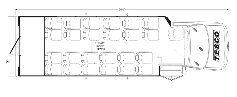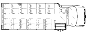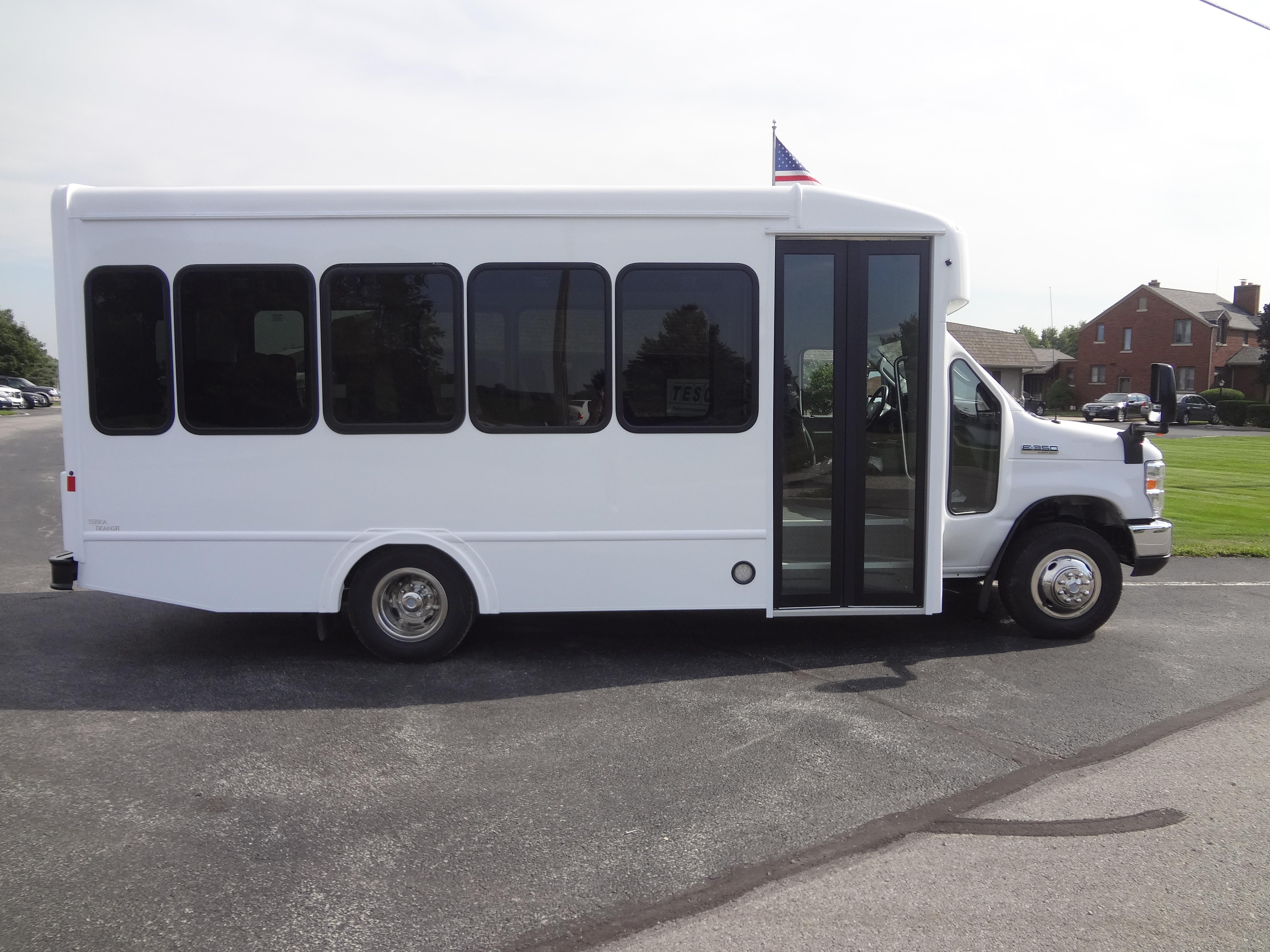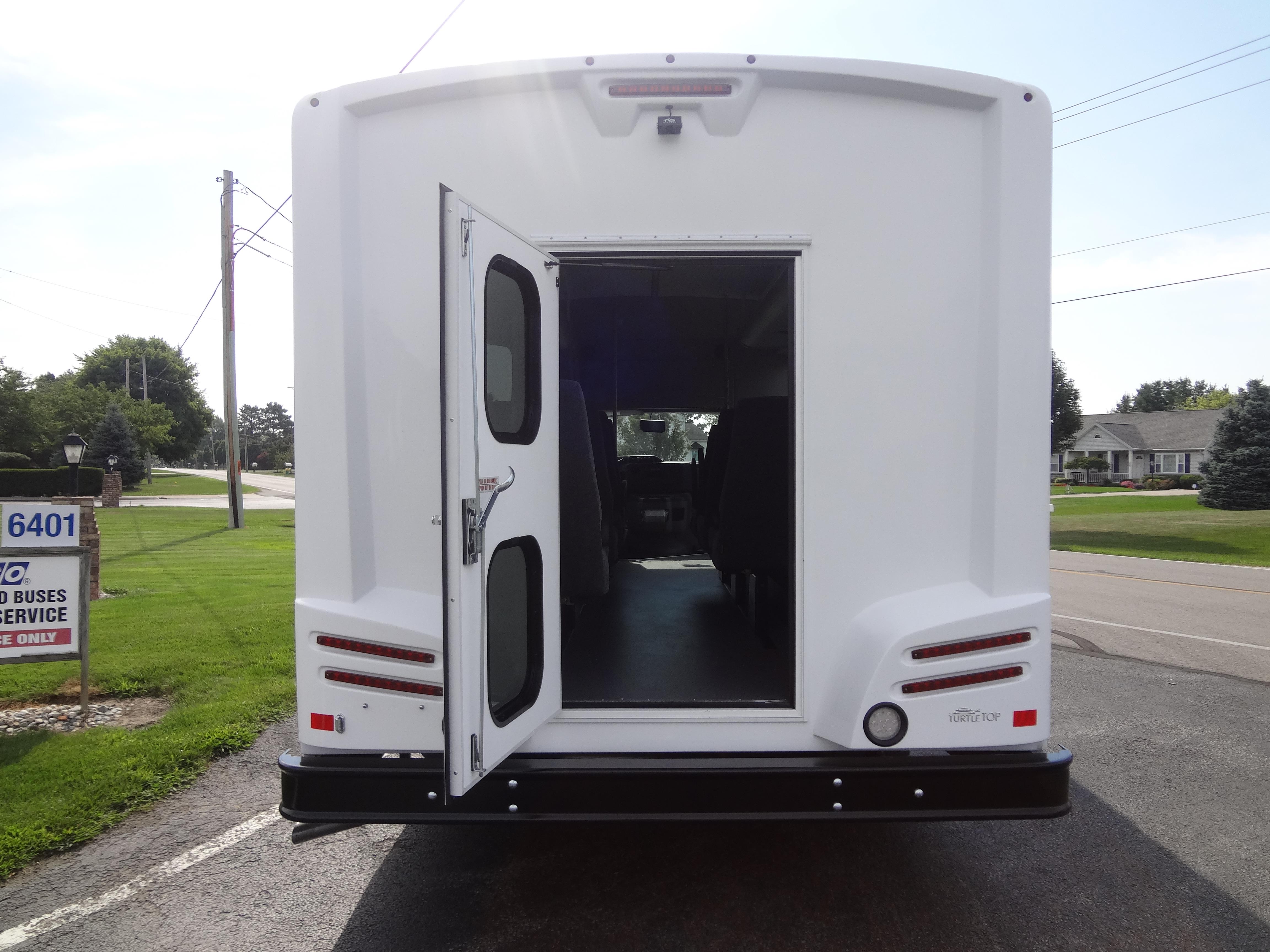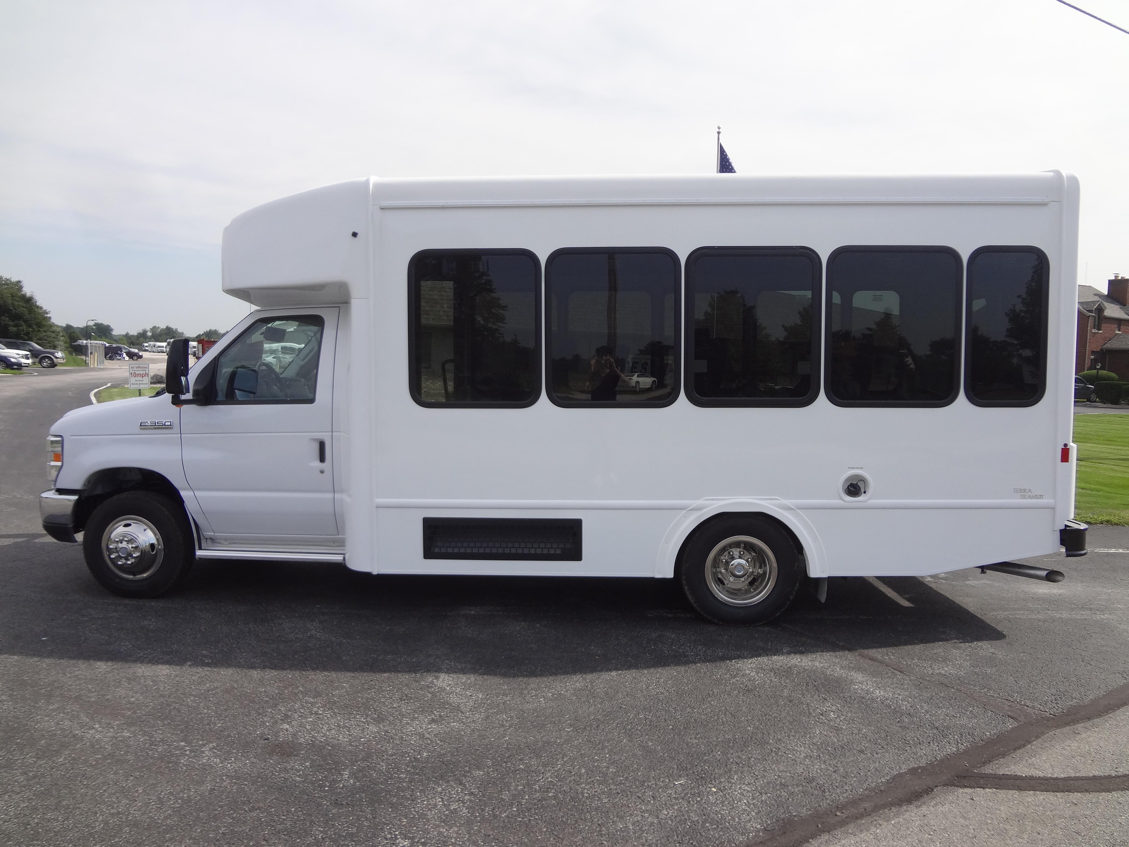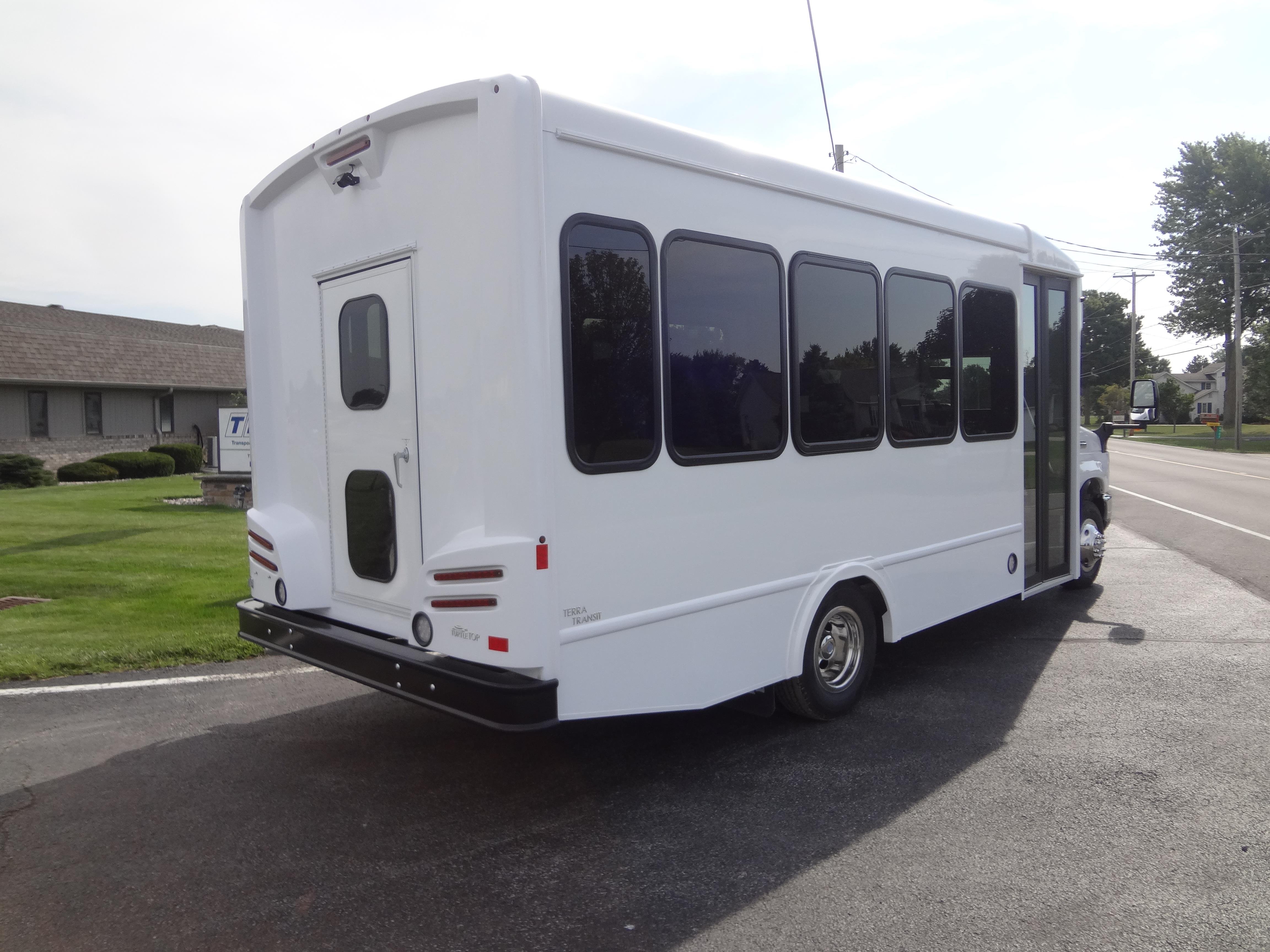 The Terra Transit shuttle bus is an economical compliment to Turtle Top's mid-size fleet. This abridged version of the Odyssey also offers seating for up to 25 passengers (plus driver) and maintains the same safety standards that Turtle Top is known for. Your riders will find it easy to enter and exit with ample headroom and aisle passage. With a variety of floor plans, you can meet your needs for storage, seating preferences, and wheelchair accessibility. A full roll cage, quality construction, and 2-year warranty make this the most affordable and practical choice for safe, dependable transportation. Count on a Turtle to keep you moving forward! DESIGNED TO MEET OR EXCEED APPLICABLE FMVSS STANDARDS and FORD QVM